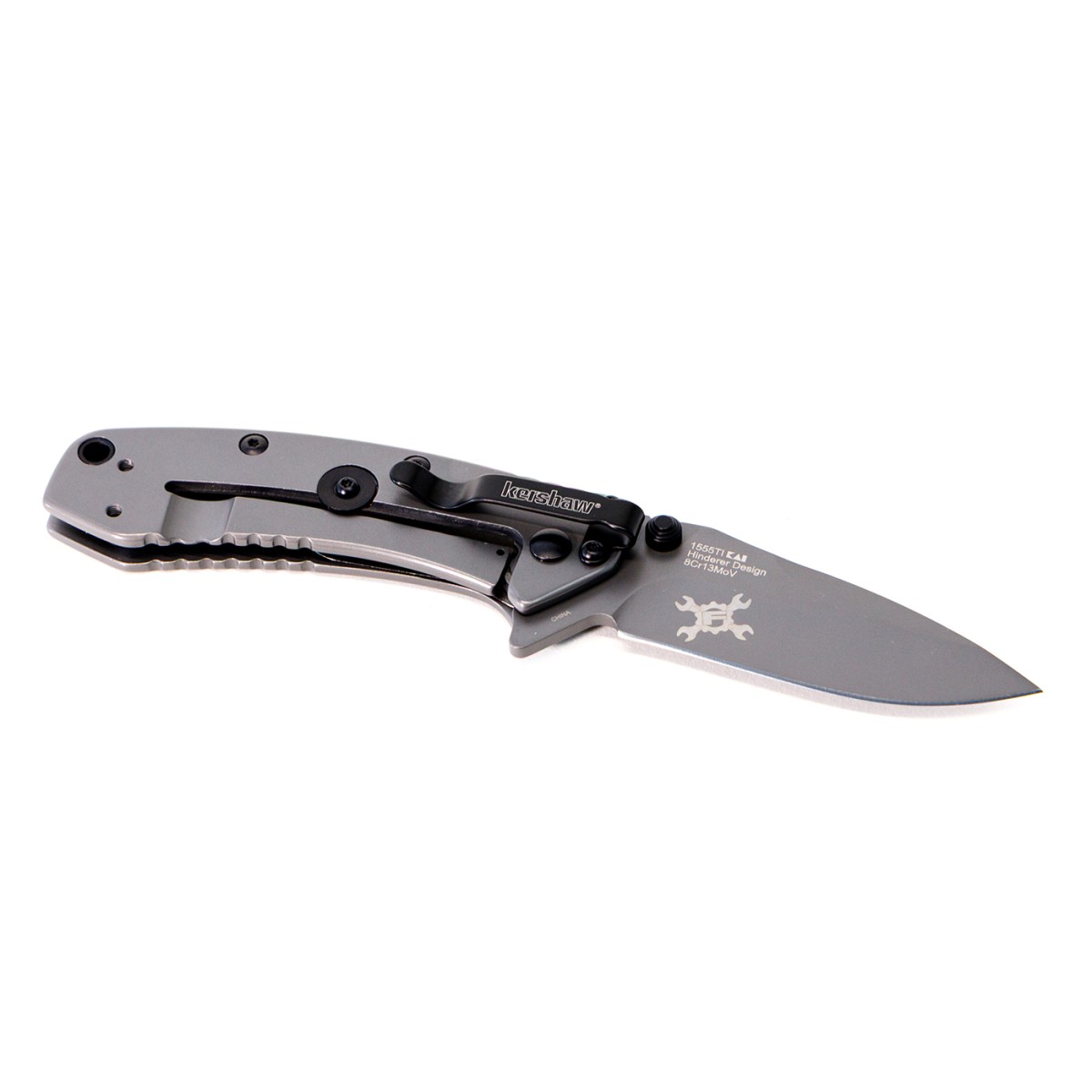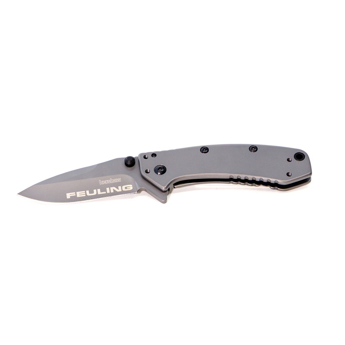 FEULING x KERSHAW Cryo Utility Knife. Stainless steel finished with matte grey titanium, carbo nitride blade and engraved with Feuling logos