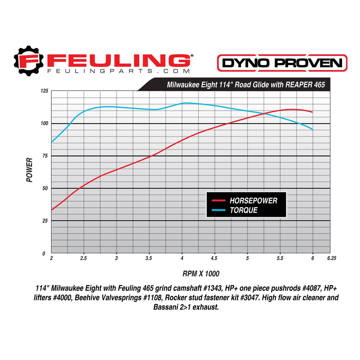 465 CAM - The 465 Reaper is an accelerator, producing solid bottom end performance with substantial gains above 2,800 RPM when compared to stock. This direct bolt in replacement for Milwaukee Eight engines can be used with stock valve springs, pushrods, lifters and exhaust. Will respond well with slip-on mufflers and or performance exhaust system and air cleaner. Use of performance valve-springs is not required but may result in a quieter, smoother running valve-train See Feuling #1107. This cam will also respond well with increased bore and or compression.