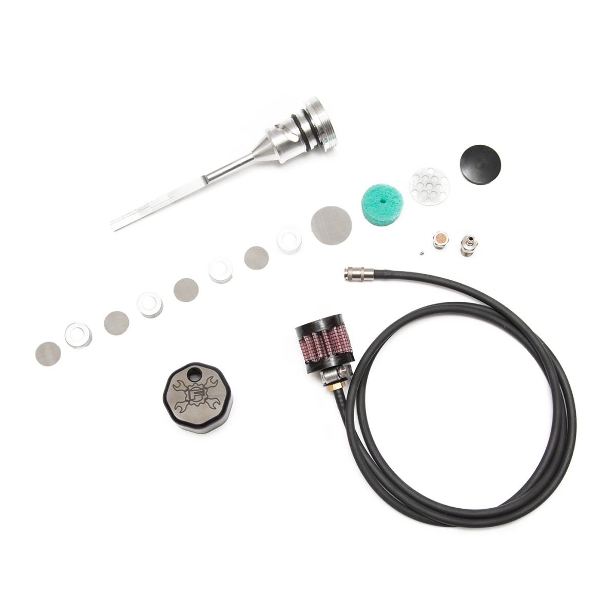 OPTION 2.) Quick disconnect coupler fitting with rubber hose and filter element. This option will run any excessive oil misting/residue through the line and into the filter element. However this option does requires disconnecting the fitting in order to check the oil. This is Feuling's preferred option as it breaths more than option 1.