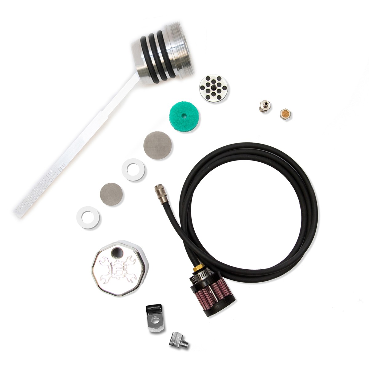 OPTION 2.) Quick disconnect coupler fitting with rubber hose and filter element. This option will run any excessive oil misting/residue through the line and into the filter element. However this option does requires disconnecting the fitting in order to check the oil. This is Feuling's preferred option as it breaths more than option 1.