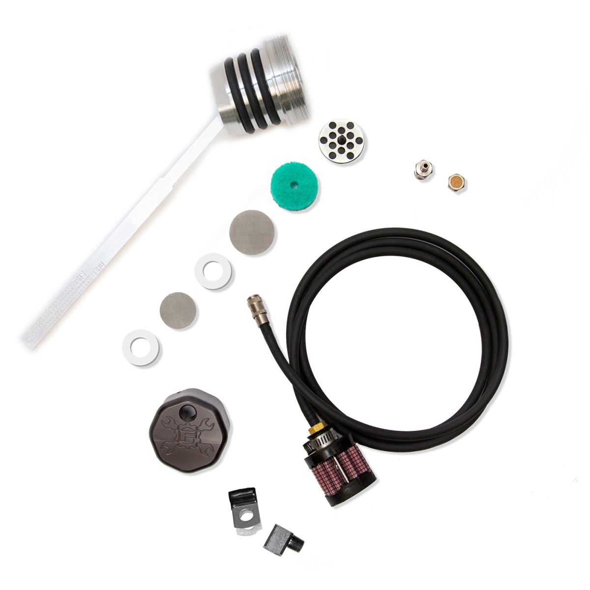 OPTION 2.) Quick disconnect coupler fitting with rubber hose and filter element. This option will run any excessive oil misting/residue through the line and into the filter element. However this option does requires disconnecting the fitting in order to check the oil. This is Feuling's preferred option as it breaths more than option 1.