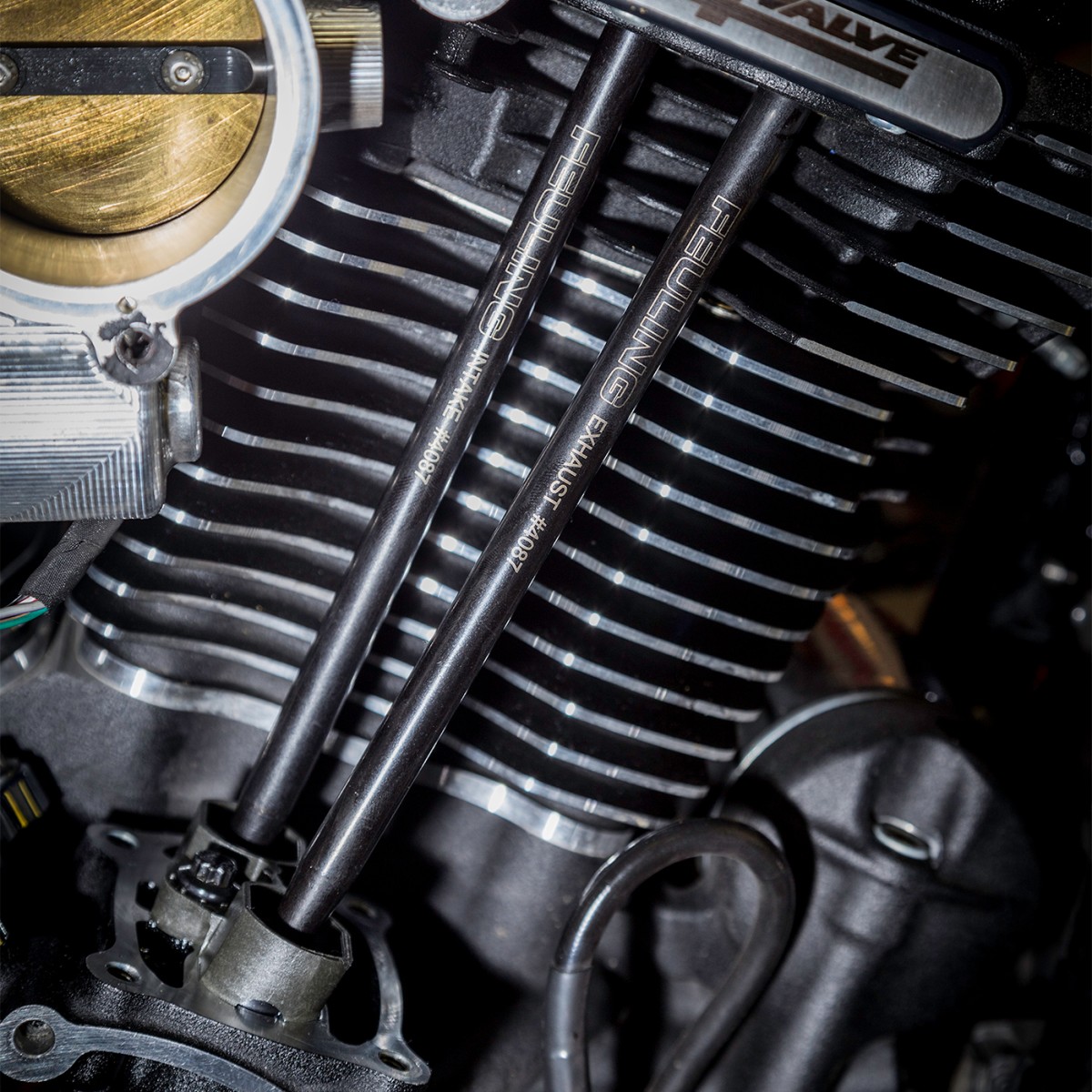 Fixed Length 4130 Chrome moly one piece pushrods with swedged formed ends. Heavy duty 7/16" diameter tube with 0.165" wall thickness, precision concentricity, heat treated with a black oxide finish. Intake and Exhaust length pushrods are stock replacement lengths and designed to work with the factory base circle camshaft dimensions. These pushrods work with all Feuling®, stock and SE® Milwaukee Eight camshafts.