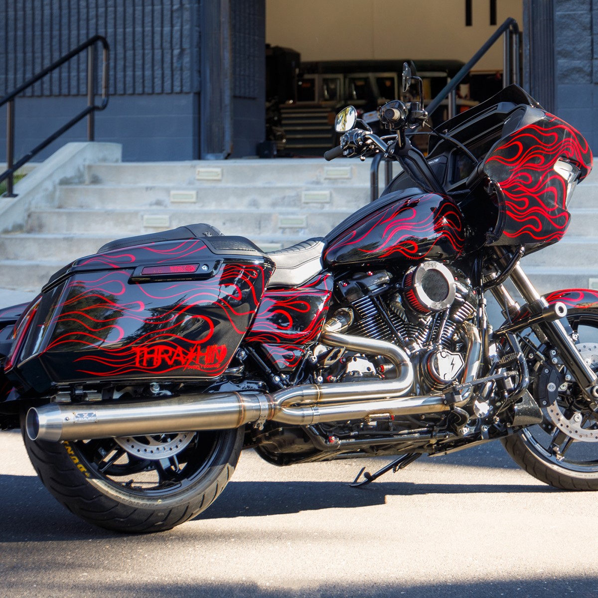 Hand Crafted, Stainless, Tuned Length, 2 into 1 high performance exhaust system for Milwaukee Eight Touring models. Triple stepped 1 ¾ to 1 7/8 to 2 with large 2 ¾ collector exit and stepped 2 ¾ to 2 7/8 dogball muffler core, normal length exhaust with end cap extended past saddlebags. Works with both extended and standard HD saddlebags. Matches with Pseudo pipe #5904