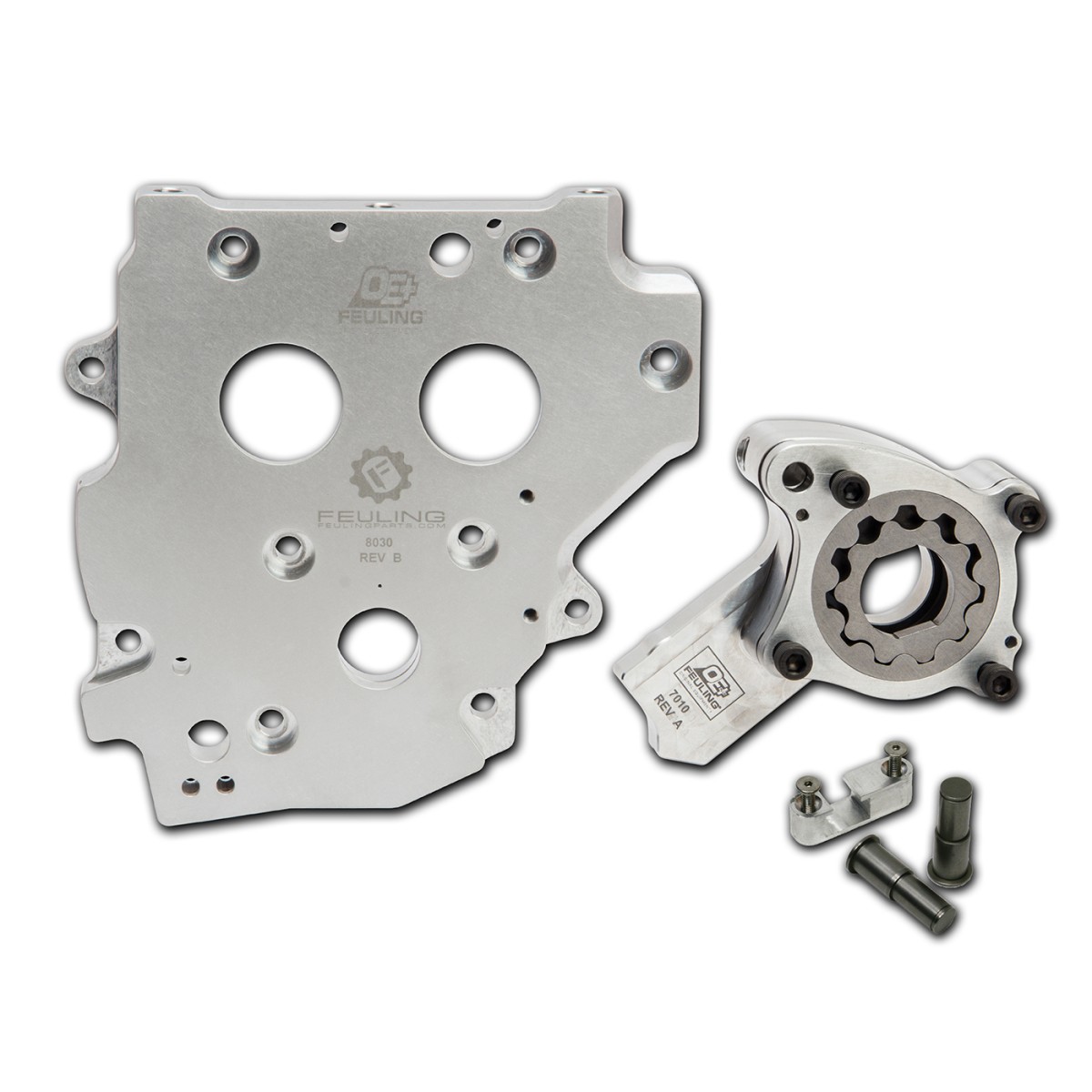 FEULING® OE+ oil pump and camplate kits are an upgrade to the stock oiling system, delivering increased oil pressure and return scavenge volumes from an OE+ billet oil pump and matched OE+ billet camplate. The OE+ billet camplates have increased rigidity and are machined to tighter tolerances compared to stock. The OE+ camplate pressure relief valve and spring are seated and pre-set with a 50-60 psi pop off.