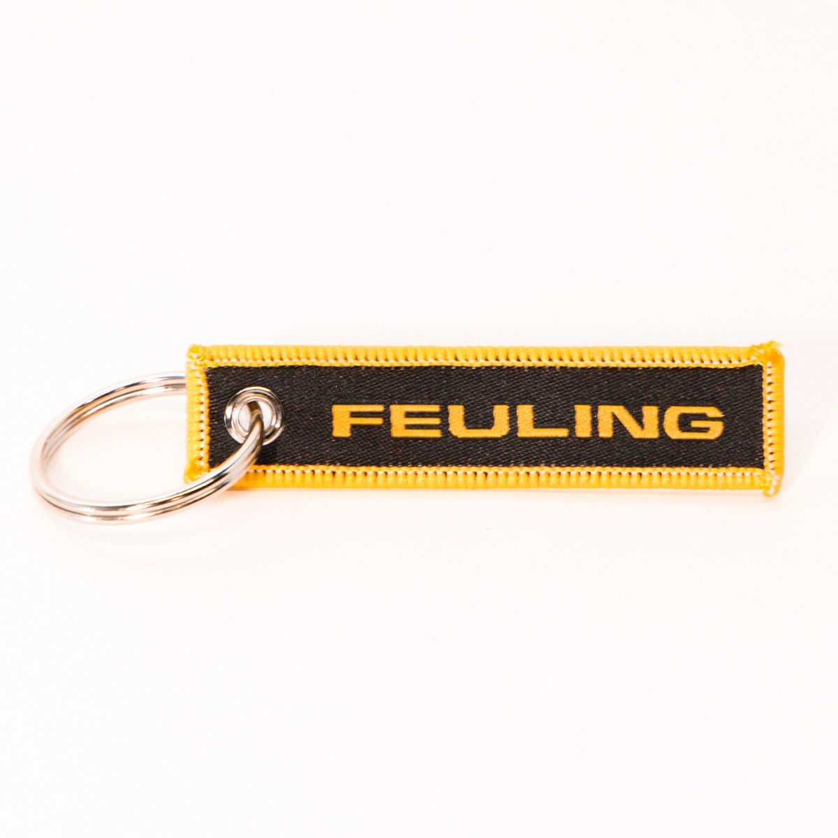 Feuling W3 flight tag woven patch keychain. Black/Gold