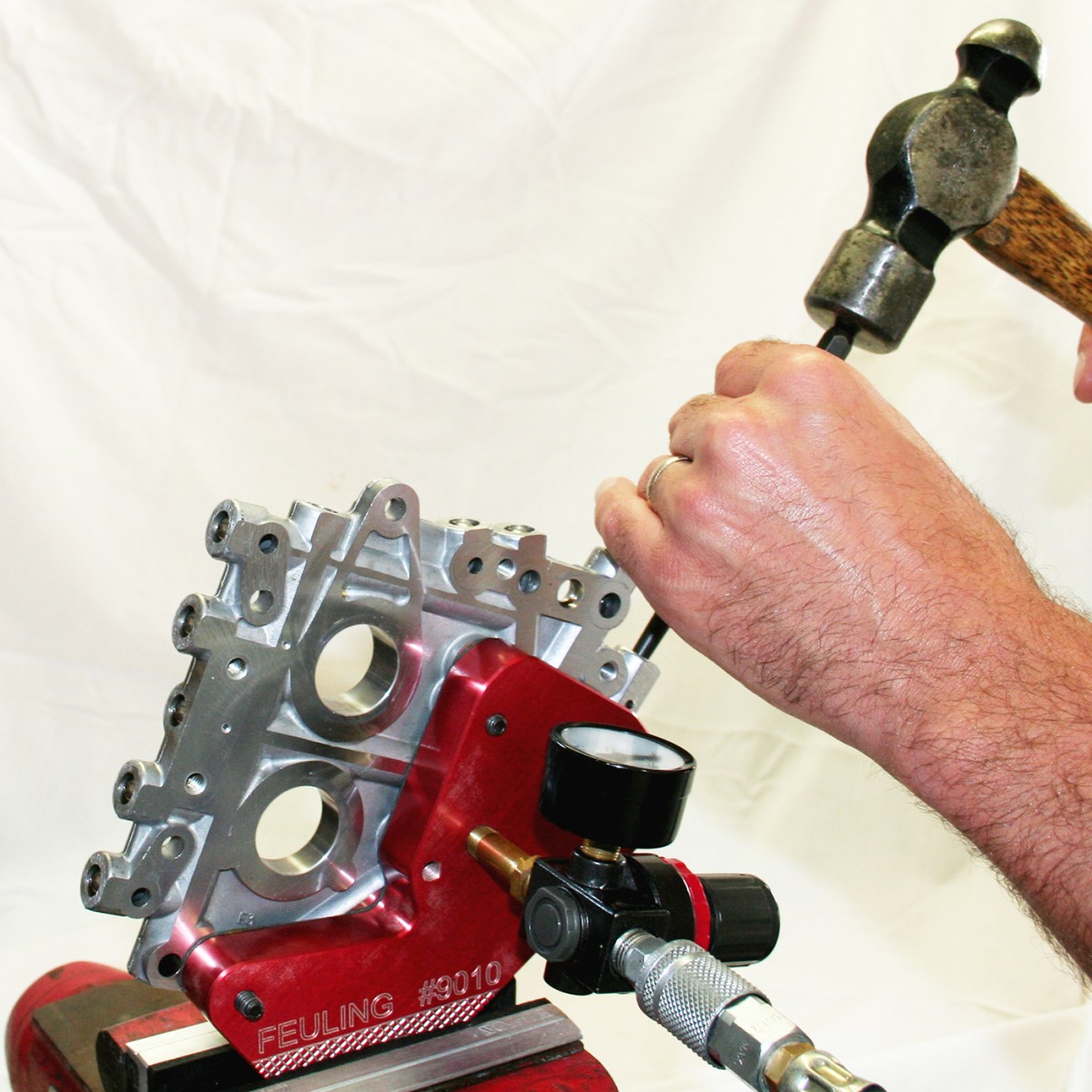 This tool allows the engine builder to know what PSI the relief valve opens; the spring tension can be adjusted to achieve the desired pop off PSI. Tool includes: air regulator, 0 – 100 psi pressure gauge, gasket & needed hardware, fits all Twin Cam engine camplates. Feuling® recommends the camplate valve be seated 0-30 psi with full pop off at 55-60 psi. Made in the U.S.A.