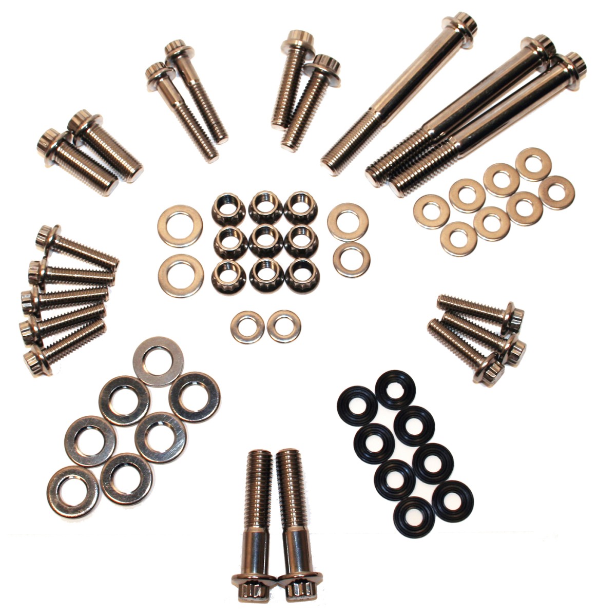 EVO Engines '84-'99, kit includes 12 point stainless bolts and applicable washers for Front engine mount, front case mount, rear engine to trans mount, oil filter adapter mount, upper oil pump, cam cover, case nuts (use factory bolts), rocker covers with sealing washers, moly paste and Loctite for installation.