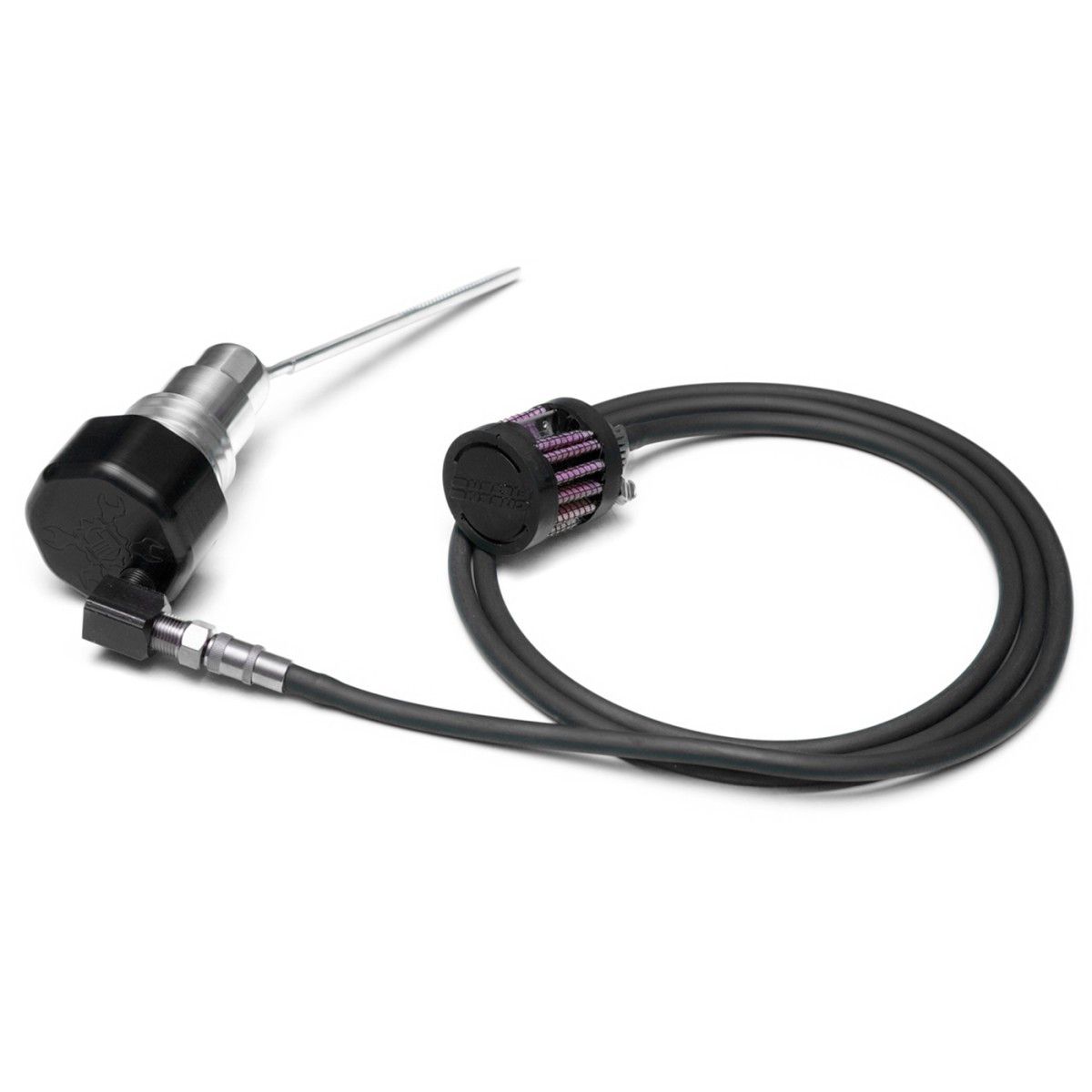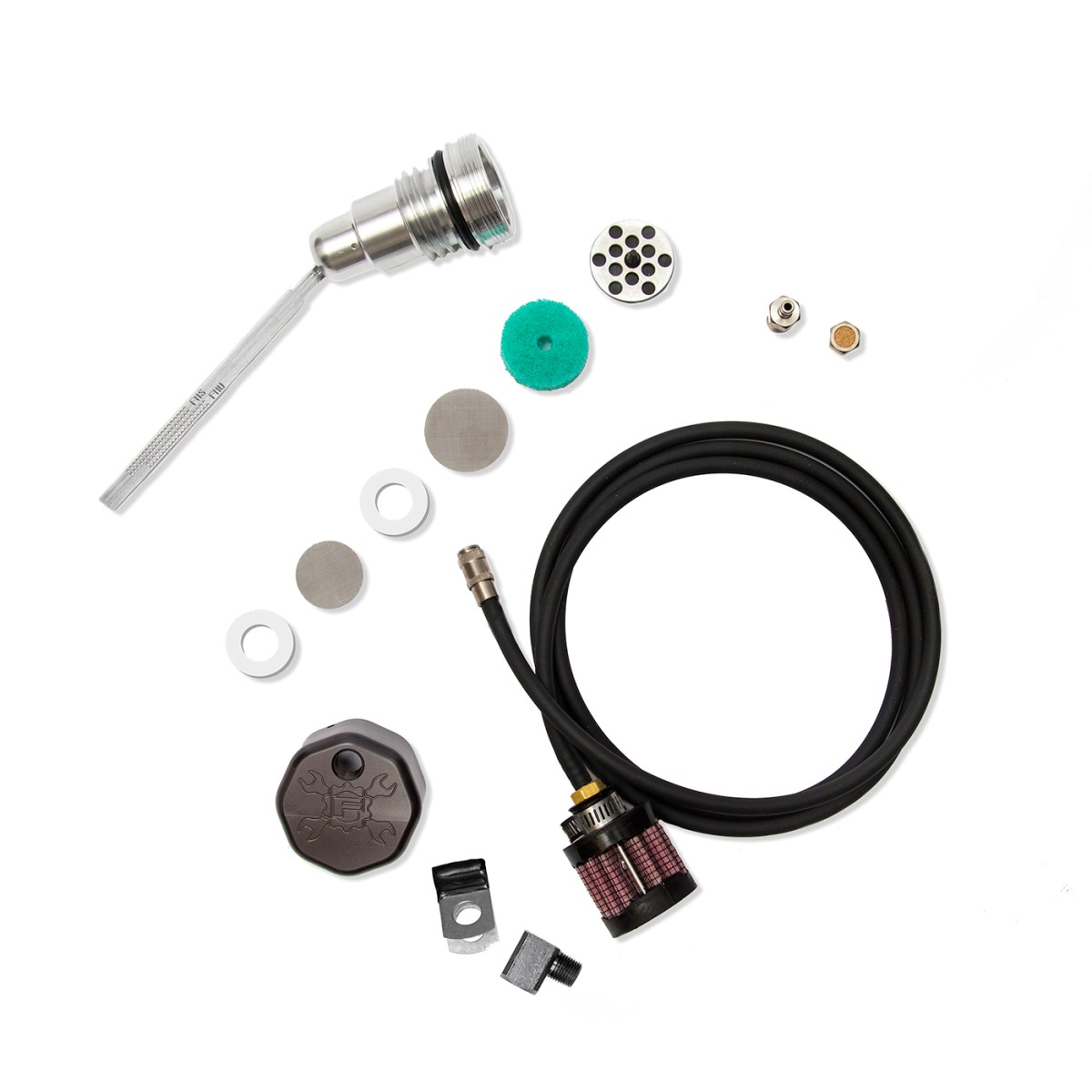 OPTION 2.) Quick disconnect coupler fitting with rubber hose and filter element. This option will run any excessive oil misting/residue through the line and into the filter element. However this option does requires disconnecting the fitting in order to check the oil. This is Feuling's preferred option as it breaths more than option 1.