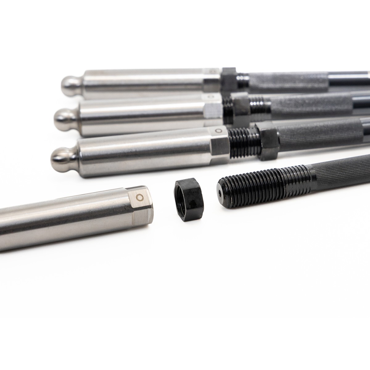 TC Quick Install Adjustable pushrods, 3/8 OD tube, 0.134" wall thickness, set of 4 pushrods. Individual length Exhaust and Intake pushrods, Install WITHOUT the removal of rocker covers, requires quick install tubes - see Feuling #4095 for tubes only or Feuling #4097 for pushrod + tube kit