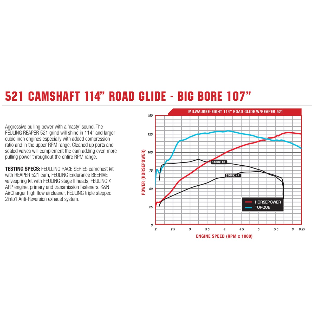 521 CAM - Aggressive pulling power with a "nasty" sound, the REAPER 521 grind will shine in 114" and larger cubic inch engines especially with added compression ratio. Ported cylinder heads are not required but will complement the cam and add even more pulling power throughout the range. The stock throttle body produces an excellent powerband and use of a high flow throttle body will increase peak power numbers. A high flow exhaust system and air cleaner is highly recommended for optimal performance.