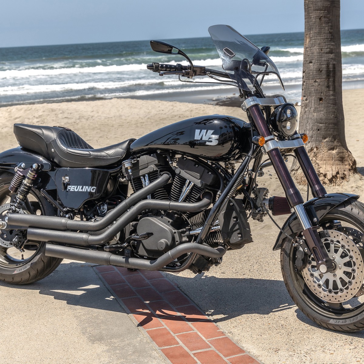 The W3® is a three cylinder W configuration engine. Air cooled, two-valve, triple gear driven cam, with a 4” bore and 4”stroke creating a 150 cubic inch monster. The engine is based on the Harley Twin Cam engine with majority of it's components interchangeable. The W3 uses its cubic inch to create the power thus keeping the package very reliable. The three-cylinder arrangement provides inherent smoothness firing at 90 degrees, and the low center of gravity is perfect for motorcycles.