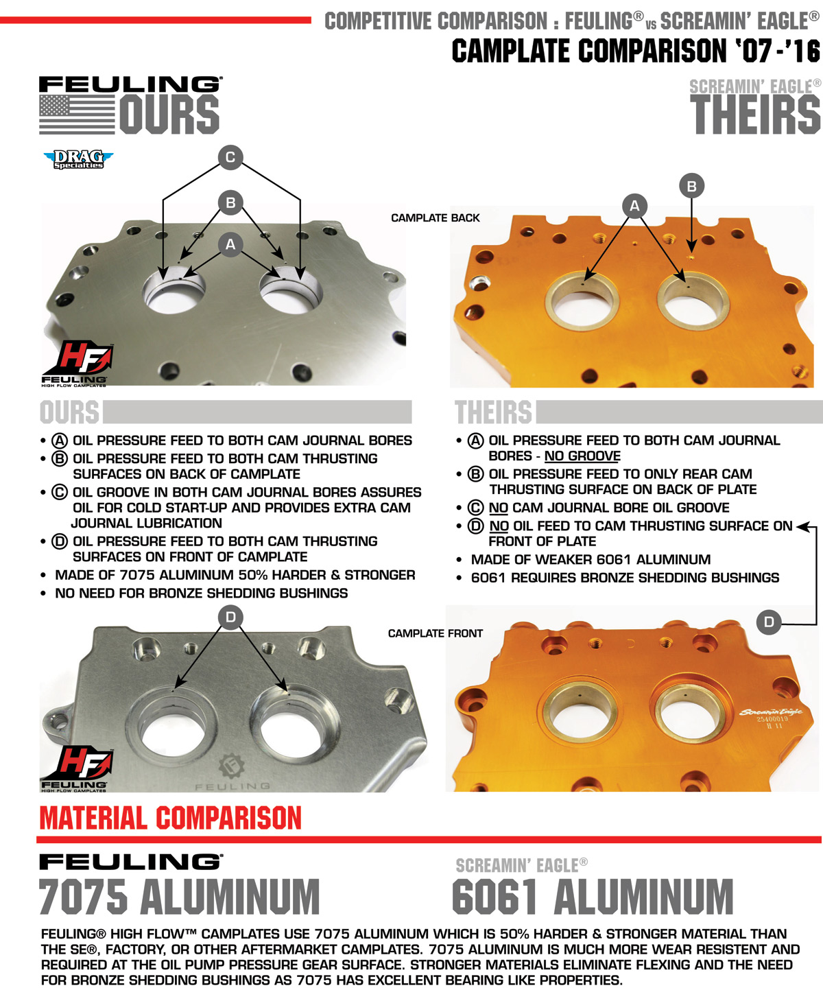 - D = FEULING CAMPLATES MACHINED FROM BILLET 7075 ALUMINUM WHICH IS 50% HARDER AND STRONGER THAN THE OEM CAST